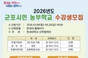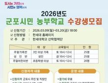 [ 한국미디어뉴스 이보영 기자 ] 군포시 도시농업 활성화 지원사업 보조사업자인 한세대학교가 오는 3월 20일까지 2026년도 군포시민 농부학교 신규 수강생을 모집한다고 밝혔다. 군포시민 농부학교는 군포시민들이 도심 속에서 직접 작물을 재배하며 친환경적인 삶의 태도를 함양하고, 이웃과 소통하는 공동체 문화를 회복하기 위해 마련됐다. 특히 단순한 농사 기술 습득을 넘어 이론과 실습이 병행된 체계적인 커리큘럼을 제공할 예정이다. 올해 모집 규모는 성인반 25구좌, 주말가족반 25구좌, 주말어린이반 20구좌로 총 70구좌이며, 교육은 한세대학교 내 위치한 도시농업지원센터 전용 농장에서 진행된다. 운영 기간은 3월부터 12월까지 약 10개월간이며 총 20강에 걸쳐 절기별 작물 재배법과 생태 교육 등 다채로운 프로그램이 이어진다. 신청 접수는 3월 9일부터 3월 20일까지 진행되며 자세한 커리큘럼 및 접수 방법은 한세대학교 홈페이지 공지사항을 통해 확인할 수 있다. 군포시 관계자는 “도시농업은 먹거리를 생산하는 즐거움을 넘어 기후 위기 시대에 탄소 중립을 실천하는 소중한 발걸음이 될 것”이라며 “많은 시민이