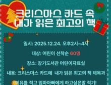 [ 한국미디어뉴스 이원희 기자 ] 김포시 장기도서관은 '크리스마스 카드 속 내가 읽은 최고의 책'을 12월 24일 오후 2시부터 4시까지 어린이 자료실에서 선착순 60명을 대상으로 운영한다. '크리스마스카드 속 내가 읽은 최고의 책'은 장기도서관 사서들이 직접 운영하는 프로그램으로 어린이들이 카드에 1년간 읽은 책 중 가장 좋았던 책의 제목과 이유를 쓰고 엄마 아빠에게도 하고 싶은 말을 써서 크리스마스 양말 카드 봉투에 담아 보는 활동이다. ‘2025년 대한민국 독서대전 김포’를 통해 많은 어린이가 장기도서관에서 방문해 책을 읽고, 어린이 특별 프로그램을 수강했다. 이번 행사는 연말 책 읽기를 권장하고, 비독자인 어린이가 독자로 도서관을 즐겁게 방문하여 다양한 활동을 할 수 있도록 진행할 예정이다.