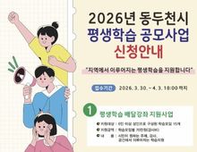 [ 한국미디어뉴스 김서안 기자 ] 동두천시는 시민들의 자발적인 학습 문화를 확산하고 지역 평생학습 공동체를 활성화하기 위해 ‘2026년 평생학습 공모사업’ 신청을 오는 3월 30일부터 4월 3일까지 접수한다고 밝혔다. 이번 공모사업은 총 3개 분야로, 시민들이 원하는 시간과 장소에서 배움을 이어갈 수 있도록 맞춤형 학습 기회를 제공하기 위해 마련됐다. 첫 번째 분야는 '평생학습 배달강좌 지원사업'으로, 학습자가 원하는 시간과 장소에서 학습할 수 있는 수요자 중심의 교육 서비스다. 6인 이상의 성인으로 구성된 학습 모임 총 15개를 선정하여 강사비 70만 원을 지원한다. 이를 통해 시민들은 원하는 주제와 장소에서 자유롭게 학습 활동을 펼칠 수 있다. 두 번째 분야는 근거리 평생학습센터인 '우리동네 학습공간' 지원사업이다. 시민들의 생활권 내 학습권을 보장하고 지역 내 평생학습 거점을 활성화하는 데 목적이 있다. 신규 또는 기존에 지정된 '우리동네 학습공간' 장소를 대상으로 하며, 프로그램 운영 시 1개소 당 150만 원의 학습 운영비를 지원한다. 이는 지역 내 유휴 공간을 학습의 장으로 탈바꿈시켜 지속 가능한