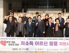[ 한국미디어뉴스 이보영 기자 ] 안양시와 안양시지역사회보장협의체는 11일 오전 11시 시청 본관 정문에서 ‘일사천리 지원사업’의 일환으로 추진하는 ‘따뜻한 겨울, 든든한 일상 어르신 물품 지원’ 전달식을 개최했다. 전달식에는 최대호 안양시장, 구재관 지역사회보장협의체 민간위원장, 강철근 만안구노인지회장, 윤용호 동안구노인지회장, 양재혁 안양시노인종합복지관장, 이승재 비산노인종합복지관장 등이 참석했다. 일사천리 지원사업은 사계절 각 시기별로 기후·재난 취약계층에게 필요한 성품을 적시에 제공해 생활 안전을 강화하는 사업이다. 앞서, 지난여름에는 폭염 대응 안전 멀티탭·서큘레이터 세트와 냉감이불이 지원됐다. 이번 물품은 겨울철 먹거리와 식생활에 취약한 어르신들을 지원하고자 사전 수요조사와 현장 의견을 반영해, 안양시 이웃돕기 성금으로 영양 보충용 건강음료 305세트와 냄비세트 78개가 마련됐다. 관내 사회복지시설·단체 10곳에는 건강음료 190세트가, 먹거리에 취약한 어르신 193가구에는 수요에 따라 건강음료 115세트 또는 냄비세트 78개가 지원된다. 동 지역사회보장협의체 위원과 노인지회, 노인복지