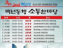 [ 한국미디어뉴스 이보영 기자 ] 오산시가 시민과 직접 만나 시정 운영 방향을 공유하고 지역 현안을 듣는 ‘2026 백년동행 소통한마당’을 개최한다. 이번 소통한마당은 오는 3월 17일부터 26일까지 관내 8개 행정동을 순회하며 진행된다. 시는 각 동을 방문해 시민들과 대화를 나누고 지역별 주요 현안과 건의사항을 청취하는 시간을 마련할 계획이다. 세부 일정은 ▲대원1동(남부종합사회복지관 대회의실, 17일 14:00~15:40) ▲초평동(초평동행정복지센터 대회의실, 18일 14:00~15:40) ▲남촌동(남촌동행정복합청사 대회의실, 19일 14:00~15:40) ▲대원2동(롯데캐슬스카이파크 키즈짐, 20일 14:00~15:40) ▲신장2동(오산농협 대회의실, 23일 14:00~15:40) ▲세마동(죽미체육공원 다목적체육관, 24일 14:00~15:40) ▲신장1동(죽미체육공원 다목적체육관, 25일 14:00~15:40) ▲중앙동(오산문화예술회관 소공연장, 26일 14:00~15:40) 순으로 진행된다. 행사는 시민과의 자유로운 대화를 중심으로 진행된다. 현장에서 제기되는 생활 불편이나 지역 현안에 대해서는 관련