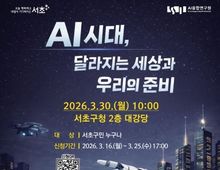 [ 한국미디어뉴스 이보영 기자 ] 서울 서초구는 오는 30일 오전 10시, 서초구청 2층 대강당에서 AX(인공지능 전환) 시대에 발맞춰 구민들의 AI 역량 강화를 돕기 위한 ‘2026 AI 미래 주민 특강’을 개최한다고 밝혔다. 이번 특강은 서초구와 숭실대학교가 함께 추진하는 지역지능화 혁신인재양성사업의 일환으로, 청년·중장년층 등 다양한 세대가 인공지능이 가져올 사회 변화를 쉽게 이해하고 실생활에서 활용할 수 있는 소양을 기를 수 있도록 마련됐다. 구는 올해 3월 특강을 시작으로 9월까지 총 3회에 걸쳐 AI 릴레이 특강을 진행할 계획이다. ‘AI 시대, 달라지는 세상과 우리의 준비’라는 주제로 진행되는 이번 특강은 『챗GPT는 내 비서』, 『AI가 인간에게 묻다』의 저자이자 전 KAIST 문술미래전략대학원 교수인 이경상 교수가 강연자로 나선다. 강연은 ‘알기 쉬운 AI 이야기와 우리 가족의 미래 준비법’을 주요 내용으로 ▲AI가 바꾸는 미래 : 생활방식의 변화 ▲우리 가족이 겪을 현실 이슈와 대응법 등을 중심으로 80분간 소통형 강연으로 진행될 예정이다. 모집 인원은 약 200명으로, 서초구민이라면 누구
