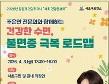 [ 한국미디어뉴스 이보영 기자 ] 서울 서초구는 연중 운영하는 ‘힐링과 건강하모니 '서초 건강콘서트'’의 일환으로, 내달 3일 서초구청 2층 대강당에서 ‘건강한 수면, 불면증 극복 로드맵’을 주제로 건강강연을 개최한다고 밝혔다. 이번 건강콘서트는 스트레스 증가와 생활 패턴 변화 등으로 수면장애를 호소하는 주민이 늘어나는 가운데 올바른 수면 습관 형성과 불면증 관리에 대한 전문 정보를 제공하기 위해 마련됐다. 이날 강연은 삼성서울병원 신경과 전문의 주은연 교수가 맡아 ▲건강한 수면의 중요성 ▲불면증의 원인 ▲일상에서 실천할 수 있는 수면 관리 방법 등을 소개할 예정이다. 이와 함께 행사 당일에는 구민들이 건강 상태를 점검할 수 있도록 오후 1시부터 구청 1층 로비에서 건강 체험부스도 운영한다. 체험부스는 ▲괄사테라피 ▲혈압·혈당 측정 ▲치매 바로알기 체험 등 3개 부스로 구성되며, ‘건강한 수면’ 주제와 연계해 이완과 스트레스 관리 방법을 체험할 수 있도록 괄사테라피 프로그램을 새롭게 도입했다. 수면 건강에 관심 있는 주민이면 누구나 신청 가능하다. 참가 신청은 안내 포스터에 게시된 QR코드를 통해 사전 예약으