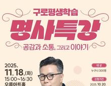 [ 한국미디어뉴스 이보영 기자 ] 구로구가 오는 11월 18일 오류아트홀에서 김영하 작가를 초청해 ‘구로평생학습 명사특강’을 개최한다. 이번 특강은 평생교육 참여 기회를 확대하고, 수준 높은 인문학 강연을 통해 구민의 문화적 감수성과 삶의 통찰을 넓히기 위해 마련됐다. 김영하 작가는 이날 ‘공감과 소통, 그리고 이야기’를 주제로 강연을 진행할 예정이다. 김영하 작가는 ‘살인자의 기억법’, ‘나는 나를 파괴할 권리가 있다’, ‘여행의 이유’ 등 베스트셀러 소설과 산문을 통해 폭넓은 독자층을 보유한 대표적인 한국 문학 작가다. 최근에는 방송 ‘알쓸신잡(알아두면 쓸데없는 신비한 잡학사전)’ 시리즈와 강연 등을 통해 대중과 적극 소통하고 있다. 특강은 오후 3시부터 4시 30분까지 진행되며, 참가비는 무료다. 수강 신청은 10월 20일부터 선착순으로 접수하며, 구로평생학습관 누리집 또는 큐알(QR)코드, 전화를 통해 신청할 수 있다. 모집인원은 총 300명이며, 구로구민과 구로구 내 직장인이 대상이다. 구는 이번 특강을 포함해 연중 총 3회에 걸쳐 다양한 분야의 명사를 초청해 평