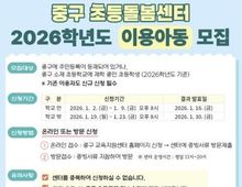 [ 한국미디어뉴스 이보영 기자 ] 서울 중구가 맞벌이 가정과 돌봄 공백이 발생하기 쉬운 가정을 지원하기 위해 2026학년도 새학기 초등돌봄센터 이용아동을 모집한다. 이용 기간은 26년 3월부터 27년 2월까지 1년이며, 돌봄 대상은 중구에 주민등록이 되어 있거나 중구 소재 초등학교에 재학 중인 초등학생이다. 기존에 돌봄센터를 이용하던 아동도 26학년도 이용을 위해서는 반드시 다시 신청을 해야 한다. 모집은 시설 유형별로 나뉘어 진행된다. 학교 안 돌봄센터 9개소에서는 1월 2일부터 9일까지 총 700명의 이용 아동을 모집하며, 학교 밖 키움센터 9개소에서는 1월 19일부터 23일까지 290명을 모집한다. 신청은 교육지원센터 홈페이지 내 ‘초등돌봄-초등돌봄신청’ 메뉴를 통해 온라인으로 가능하며, 신청 후 해당 돌봄센터에 증빙서류를 방문 제출하면 된다. 또한 평일 오전 11시부터 저녁 8시까지 센터 운영시간 내에 증빙서류를 지참해 직접 방문해서 신청할 수도 있다. 돌봄서비스는 학기 중에는 방과 후부터 저녁 8시까지, 방학 중에는 오전 8시부터 저녁 8시까지 제공된다. 돌봄 시간 동안에는 무료 급식과