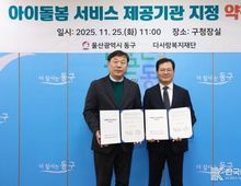 [ 한국미디어뉴스 이원영 기자 ] 울산 동구는 11월 25일 오전 11시 구청장실에서 사회복지법인 다사랑복지재단(대표 권오헌)과 아이돌봄 서비스 제공기관 지정 협약을 체결했다. 공개 모집을 통해 선정된 다사랑복지재단은 동구 아이돌봄 지원사업의 전반적인 운영과 관리를 위탁받아 2026년 1월 1일부터 2030년 12월 31일까지 5년간 아이돌봄 지원사업을 수행하게 된다. 아이돌봄서비스는 맞벌이, 한부모, 다자녀 가정 등을 대상으로 양육 공백이 발생한 가정의 12세 이하 아동을 대상으로 전문 교육을 받은 아이돌보미가 찾아가는 돌봄서비스를 제공하여 부모의 양육 부담을 덜어 저출산 해소에 도움을 주는 사업이다. 돌봄이 필요한 가정은 시간제 돌봄, 영아종일제, 질병 감염 아동 지원, 등·하원 지원 등 다양한 유형의 서비스를 선택해 이용할 수 있으며, 정부는 가구 소득 수준에 따라 이용 요금을 차등 지원한다. 특히, 동구는 자체 사업으로 12세 이하 자녀가 2명 이상인 다자녀 가정의 셋째 아 아이돌봄서비스 이용 요금 본인부담금 지원과 질 높은 보육환경 조성을 위한 어린이집 기관 연계 부담금 지원 및 아이돌보미 역량 강화
