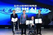 [ 한국미디어뉴스 이보영 기자 ] 김천시장애인체육회는 2월 25일 김천시청 3층 강당에서 ‘스포츠 중심도시 김천에서 장애인과 비장애인 모두가 함께하는 스포츠 환경 조성’을 위한 김천시장애인체육회의 공식 출범식을 가졌다. 이번 행사에는 배낙호 회장을 비롯하여 장애인체육회 임원 등 300여 명의 내빈들이 참석하여 장애인체육회의 힘찬 출범을 알렸다. 행사는 장애인과 비장애인이 조화롭게 어우러지는 김천의 미래를 그리듯 시립교향악단의 연주와 시립합창단의 합창으로 구성된 식전 공연으로 시작됐으며, 여상규 상임부회장의 출범선언, 손태옥 사무국장의 경과보고가 진행됐다. 이어 회기의 릴레이 전달, 도장애인체육회의 인준패 전수, 공로패 수여, 가맹단체 인준서 수여가 진행됐으며, 배낙호 회장의 기념사, 안용우 도장애인체육회 상임부회장 격려사, 나영민 의장, 박선하 도의원, 최한동 김천시체육회장의 축사와 떡케이크 절단 퍼포먼스가 이어졌다. 김천시는 2024년 12월 2일 장애인체육회 설립추진계획을 수립하고 12월 11일 설립준비위원회 구성, 수차례의 회의를 거치고 규약 및 제규정의 제정, 인력채용 및 사무실 인프라 구