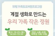 [ 한국미디어뉴스 이원영 기자 ] 인천광역시교육청연수도서관은 오는 10월 25일 오후 2시 평생학습1실에서 가족 이용자를 위한 ‘10월 가족 토요체험 프로그램’을 운영한다. 이번 프로그램은 ‘우리 가족 마음 정원’을 주제로 가을의 정취를 담은 그림책을 함께 읽으며 가족의 마음을 돌아보고 함께 소통하는 시간을 갖는다. 이어지는 원예 활동에서는 계절 생화를 활용해 가족의 작은 정원을 만들며 자연과 감성을 나눌 예정이다. 참여 신청은 10월 13일부터 연수도서관 누리집에서 선착순 접수하며, 자세한 내용은 연수도서관 독서문화과 로 문의하면 된다.