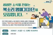 [ 한국미디어뉴스 이종철 기자 ] 광주광역시 북구는 구정 소식지인 ‘북소리’를 통해 지역의 생생한 소식을 전달하는 명예기자단을 모집한다고 14일 밝혔다. ‘북소리 명예기자단’은 구정 홍보에 주민들의 참여를 활성화하기 위해 지난 2009년 발족한 이후 현재까지 운영되고 있다. 이번 모집에서는 제9기 명예기자단 40여 명을 선발할 계획이다. 지역사회에 관심이 많고 기사 작성 및 인터넷 활용 능력을 갖춘 북구 주민이라면 누구나 신청할 수 있다. 모집 기간은 다음 달 12일까지이며 신청 방법은 지원서와 자유 주제 기사 1개를 작성해 이메일로 제출하면 된다. 지원자들이 제출한 서류를 바탕으로 맞춤법, 문장 표현력, 구정 이해도 및 관심도 등의 기준에 따라 심사한 뒤 2월 말 최종 합격자를 확정될 계획이다. 선발된 명예기자는 오는 3월부터 2년간 활동하며 주민들의 시선에서 지역 소식과 미담 사례 등을 취재해 ‘북소리’에 연 1회 이상 기사를 게재한다. 북구는 명예기자단의 원활한 활동을 위해 편집회의, 워크숍, 교육 등을 지원하고 원고가 채택될 경우 소정의 원고료를 지급할