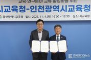 [ 한국미디어뉴스 이원영 기자 ] 인천광역시교육청은 울산광역시교육청과 4일 울산시교육청에서 ‘읽걷쓰 문화 확산을 위한 상호 협약’을 체결하고, 양 기관의 교류와 협력을 강화하기로 했다. 이번 협약은 인천시교육청의 읽걷쓰 교육 철학에 공감대를 형성하고, 교육·연구 분야 교류 및 지역 특성에 맞는 교육 모델 공동 개발을 추진하기 위해 마련됐다. 양 교육청은 ▲교육·연구 교류 활성화 ▲읽걷쓰·책크인·민주시민교육 등 프로그램 연계 ▲지역 문제 해결 및 사회공헌 프로그램 공동 운영 등을 추진하기로 합의했다. 또한 한국교원대학교에서 개발 중인 읽걷쓰 전국 단위 교원 연수비용 할인을 울산광역시교육청에도 적용하기로 했다. 협약식 후 도성훈 교육감은 ‘읽걷쓰와 함께하는 인천 평화교육’주제 강연에서 인간과 자연, 인공지능이 공존하는 시대에 나다움과 인간다움을 갖춘 애기애타 정신의 중요성과 인천교육청의 평화·민주시민교육 사례를 공유했다. 울산교육청 관계자는 “인천교육청의 읽걷쓰 철학에 깊이 공감한다”며 “양 기관의 협력으로 학생들의 삶과 학습을 연결하는 교육 혁신을 추진하겠다”고 전했다. 도