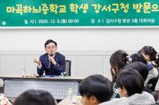 [ 한국미디어뉴스 이원영 기자 ] 진교훈 서울 강서구청장이 8일 구청 대회의실에서 마곡하늬중학교 3학년 학생들과 직접 대화하며 소통하는 시간을 가졌다. 구는 행정이 어떻게 이뤄지고, 공무원이 어떤 역할을 하는지 학생들이 현장에서 직접 체험하며 이해할 수 있도록 이날 자리를 마련했다. 3학년 1반과 4반 학생 40여 명이 구청을 찾아 진 구청장과 만났다. 진 구청장은 “구청에 직접 와보니깐 어때요?”라고 질문을 하며 대화를 이끌어갔다. 학생들의 장난스러운 질문에도 유쾌하게 답변했고 대화 내내 웃음이 끊이지 않았다. 길거리 흡연 등 생활불편부터 강서구의 주요 정책과 예산 규모, 10년 후 강서구에 필요한 정책에 이르기까지 폭넓게 대화했다. 진 구청장은 “마곡지구 발전과 맞물려 유동인구가 많아짐에 따라 간접흡연 피해 민원도 늘고 있다”며 “흡연 단속과 계도를 병행해 피해를 줄여나가겠다”고 말했다. 마곡 통합신청사와 신경제축 조성 등 굵직한 사업에 대해서는 학생들의 눈높이에 맞춰 알기 쉽게 설명했다. 10년 후 정책에 대해선 “변화의 속도가 매우 빠르기 때문에 기술