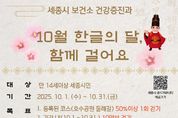 [ 한국미디어뉴스 이보영 기자 ] 세종특별자치시 보건소가 1일부터 31일까지 한글날을 맞아 ‘10월 한글의 달 함께 걸어요’ 걷기 도전 행사를 운영한다. 이번 행사는 오는 9∼11일 개최하는 세종한글축제와 한글날을 기념하고, 시민들의 건강을 증진하기 위해 마련됐다. 걷기 도전 행사에 참여하려면 세종호수공원 둘레길 50% 이상을 1회 이상 걷고, 10월 중 총 10만 보를 달성하면 된다. 시 보건소는 조건을 충족한 참여자 중 300명을 추첨, 지역화폐 여민전 3,000원을 지급한다. 참여 방법은 본인 명의 휴대전화에 ‘워크온’ 앱을 설치한 뒤 ‘세종시공식커뮤니티’에 가입하고, ‘10월 한글의 달 함께 걸어요’ 걷기 도전을 신청하면 된다. 김수영 보건소장은 “시민들이 걷기 도전을 통해 건강한 생활습관을 실천하고, 한글날과 축제의 의미도 되새기는 계기가 되길 바란다”고 말했다.