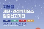 [ 한국미디어뉴스 이원영 기자 ] 청양군은 겨울철 재난과 안전사고 예방을 위해 지난 1일부터 오는 2026년 2월 28일까지 약 3개월간 ‘겨울철 재난·안전 위험요인 집중신고기간’을 운영한다고 밝혔다. ‘안전신문고’는 국민 누구나 생활 주변의 각종 재난·안전 위험요인을 사진 또는 동영상으로 촬영해 신고할 수 있는 온라인 신고 시스템으로, 홈페이지와 모바일 앱을 통해 간편하게 이용할 수 있다. 이번 집중신고 기간은 겨울철에 특히 많이 발생하는 재난·안전사고를 사전에 예방하기 위해 마련된 것으로, 주요 신고 유형은 ▲대설 ▲한파 ▲화재 ▲축제·행사 등 4개 분야다. 대설 분야에서는 ▲도로 제설 미흡 ▲제설함 관리 불량 ▲시설물 붕괴 위험 등을, 한파 분야에서는 ▲인도 결빙 ▲고드름 낙하 ▲한파 쉼터 불편 사항을 신고할 수 있다. 또한 화재 위험과 관련해 ▲비상구 물건 적치 ▲담배꽁초 투기 ▲소화시설 불량 ▲불법 취사·소각 등을, 축제·행사 분야에서는 ▲인파 밀집 우려 ▲행사장 시설 파손 등을 신고 대상으로 하고 있다. 신고는 안전신문고 앱 또는 홈페이지에서 ‘겨울철 집중 신고’ 메뉴를 선