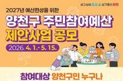 [ 한국미디어뉴스 이보영 기자 ] 양천구는 2027년 예산 편성 과정에 구민의 목소리를 반영하기 위해 ‘주민참여예산 제안사업’ 공모를 오는 5월 15일까지 진행한다고 밝혔다. ‘주민참여예산제’는 예산 편성 과정에 구민이 직접 참여해 지역에 필요한 사업을 제안하고 결정함으로써 예산 운영의 투명성을 높이고 실질적인 재정 민주주의를 실현하는 제도다. 구는 주민참여예산제의 실효성을 높이기 위해 올해부터 운영 방식을 대폭 개선했다. 제안 이후 최종 선정까지의 모든 과정을 단계별로 공개하고, 제안자에게 개별 안내를 제공해 진행 상황을 투명하게 공개한다. 또 부서 검토 단계에서 제안자와의 소통을 강화해 사업을 구체화하고 채택 가능성을 높일 계획이다. 이번 공모의 총예산 규모는 18억 원이며, ‘일반 제안사업’ 15억 원과 ‘주민자치회 제안사업’ 3억 원 등 2개 분야로 나뉜다. ‘일반 제안사업’은 생활 속 불편 해소를 위한 주민 밀착형 사업, 복리 증진 및 지역경제 활성화 사업, 청년 문제 해결 사업, 청소년 학습·진로 사업 등을 대상으로 하며, 사업 1건당 최대 2억 원까지 편성 할 수 있다.