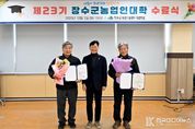 [ 한국미디어뉴스 이종철 기자 ] 장수군은 2일 장수군농업기술센터에서 최훈식 장수군수와 최한주 군의회 의장, 수료생 80여 명이 참석한 가운데 ‘제23기 장수군 농업인대학 수료식’을 개최했다고 밝혔다. 올해 장수군 농업인대학은 지난 3월에 개강해 11월까지 농업인의 전문능력 향상을 위해 사과·두릅·지속가능한 치유농업 등 총 3개 과정을 편성해 교육생 132명을 대상으로 진행했다. 교육은 이론 수업과 현장 실습을 병행한 총 37회, 175시간의 체계적인 프로그램으로 구성됐으며, 이를 통해 장수농업을 선도할 수 있는 87명의 수료생을 배출했다. 수료식에서는 올해 교육 운영 과정에서 자치활동에 공로가 큰 백승덕 교육생에게 공로상이 수여됐으며, 김연수·김형중 교육생이 전 과정을 우수한 성적으로 이수해 우수상을 받았다. 다양한 지역 농업인들이 함께 참여한 본 과정은 단순한 기술 습득을 넘어 농업경영 역량을 강화하는 데 실질적 도움이 된 것으로 평가되고 있다 수료생들은 “농업인대학에서 배운 지식과 경험을 현업에 적용해 고품질 농산물 재배와 효율적인 경영관리로 소득을 높이는데 도움이 되는 유익한