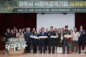 [ 한국미디어뉴스 김풍옥 기자 ] 청주시는 17일 청주도시재생허브센터에서 사회적경제기업 및 지역 단체 관계자 100여명이 참석한 가운데 ‘2025년 사회적경제 성과공유회’를 개최했다. ‘내일의 사회적경제를 말하다’를 주제로 진행된 이번 성과공유회는 올해 청주시 사회적경제기업의 성과를 기념하고, 내년 사회적경제 정책 전망을 공유해 발전 방향을 모색하기 위해 마련됐다. 행사에서는 올해 진행된 우수사례 소개가 발표됐으며, 이어 사회적경제 활성화에 기여한 ㈜미래이엔티, ㈜싱글룸, SK하이닉스(주) 등 3개 기업에 유공 표창이 수여됐다. 또한 2026년 사회적경제기업이 자생적으로 성장할 수 있는 정책 전망 세미나를 열어 기업 간 협력과 네트워크를 강화하는 자리를 만들었다. 청주시는 앞으로도 사회적경제기업이 경쟁력을 강화할 수 있도록 경영 컨설팅, 사회적가치지표(SVI) 컨설팅, 박람회 참가 및 판로지원 등 다양한 정책사업을 지원하며 지역사회와 상생하는 사회적경제 생태계 조성을 지속적으로 추진해 나갈 계획이다. 이범석 청주시장은 “이번 성과공유회를 계기로 청주시 사회적경제기업이 더욱 활성화되고