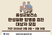 [ 한국미디어뉴스 김풍옥 기자 ] 음성군보건소는 만성질환자의 합병증을 조기에 발견하고 중증 심뇌혈관질환을 예방하기 위해 3월 3일부터 31일까지 ‘2026년 만성질환 합병증 검진 사업’ 대상자를 모집한다. 이번 사업은 고혈압·당뇨병·이상지질혈증 환자 410명을 대상으로 정밀 검진을 지원해 합병증 발생 위험을 사전에 확인하고, 체계적인 건강관리로 연계하기 위해 추진된다. 검진 항목은 △혈액검사(총콜레스테롤, 당화혈색소, 전해질 등) △소변검사(미세단백뇨) △안과검사(안저검사, 안압 측정 등) △경동맥 초음파 검사(고위험군 우선)로 구성돼 있다. 이 중 안과검사와 경동맥 초음파 검사는 협약 의료기관에 의뢰해 실시하는 위탁검사로 진행되며 모든 검사는 무료로 지원된다. 고혈압과 이상지질혈증은 자각 증상이 거의 없어 관리의 중요성을 놓치기 쉽고, 당뇨병 또한 장기간 방치할 경우, 망막병증·신장질환 등 심각한 합병증으로 이어질 수 있다. 특히 이러한 만성질환은 뇌졸중과 허혈성 심질환 등 중증 심뇌혈관질환의 주요 위험 요인으로 작용하는 만큼 정기적인 합병증 검진이 필수적이다. 검진 대
