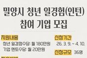 [ 한국미디어뉴스 최정화 기자 ] 경남 밀양시는 청년들에게 양질의 일경험을 제공하고 지역 기업의 인력난을 해소하기 위한 ‘2026년 청년 일경험(인턴) 지원사업’에 참여할 기업을 오는 4월 10일까지 모집한다. 이 사업은 미취업 청년에게는 진로 탐색과 실무 역량 강화의 기회를 제공하고, 기업에는 지역의 우수한 맞춤형 인재를 채용할 수 있도록 지원하는 청년 일자리 상생 프로그램이다. 시는 이번 공고를 통해 참여 기업을 선정하며, 선정된 기업은 총 36명 규모 내에서 청년 인턴을 직접 채용하게 된다. 인턴 채용 시 기업은 청년 일경험수당 월 180만원과 전담 멘토 수당 월 20만원을 합쳐, 인턴 1명당 매월 200만원의 지원금을 최대 3개월간 받을 수 있다. 신청 자격은 밀양시에 사업장을 둔 상시근로자 3인 이상의 기업 혹은 단체다. 참여를 희망하는 기업은 밀양시 대표 누리집의 고시·공고란을 참고해 신청서를 작성한 후, 밀양시 인구정책담당관으로 방문하거나 우편으로 제출하면 된다. 시 관계자는 “기업에는 우수 인재 채용의 통로가 되고, 청년에게는 지역 안착의 계기가 되는 사업인 만큼 관내 기업들의 많은