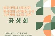 [ 한국미디어뉴스 이종철 기자 ] 광주광역시는 23일 오후 4시 광주광역시의회 5층 예결위회의실에서 ‘광주광역시 시민사회 활성화와 공익활동 증진을 위한 기본계획(제1차, 2026~2028)’ 최종보고회 겸 공청회를 개최한다. 광주시가 주최하고 광주시민사회지원센터가 주관하는 이번 공청회는 향후 3년간 광주 시민사회의 지속가능한 발전을 위한 정책방향을 최종 확정하기 전 시민사회 현장의 의견을 수렴하기 위해 마련됐다. 광주시는 2023년 ‘광주광역시 시민사회 활성화와 공익활동 증진 조례’를 제정하고, 2024년 7월 기존 ‘광주NGO지원센터’를 ‘광주시민사회지원센터’로 전환하며 시민사회 지원 기반을 확대했다. 올해는 전문가-행정-센터가 참여하는 ‘기본계획수립 전담팀(TF)’을 구성해 본격적인 연구에 착수했다. 전담팀(TF)은 지난 4월부터 수차례 논의와 자문을 거쳐 기본계획의 기틀을 마련했으며, 시민 및 시민사회 설문조사, 활동가 직급별 포커스그룹인터뷰(FGI) 결과를 반영해 비전과 목표, 추진전략을 구체화했다. 이번에 공개되는 기본계획은 ▲시민사회 기반과 역량 강화 ▲시민참여와 활동가 저변 확대 ▲공