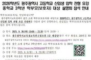 [ 한국미디어뉴스 이종철 기자 ] 광주시교육청은 오는 30일 오후 7시 광주시교육청교육연구정보원 대강당에서 중학교 3학년 학생과 학부모를 대상으로 ‘고입 전형요강 설명회’를 개최한다. 이번 설명회는 고등학교 입학을 앞둔 학생·학부모의 궁금증을 해소하고, 진로·진학 선택에 도움을 주기 위해 마련됐다. 설명회에서는 ▲자율형공립고 ▲과학중점학교 ▲전기고(마이스터고・특성화고・특목고・예술고·체육고 등) ▲후기 일반고 전형요강 등을 안내하고 질의응답을 진행한다. 설명회 참여 신청은 오는 23일까지 온라인'으로 하면 된다. 현장 접수도 가능하며, 행사에 참석하지 못하는 학부모를 위해 시교육청 유튜브 채널을 통해 실시간 중계할 예정이다. 올해 고등학교 원서 접수는 ▲10월 20일 산업수요맞춤형고(마이스터고) 및 광주형마이스터고 ▲10월 21일 광주예술고 ▲11월 3일 광주체육고 ▲11월 24일 특성화고 ▲12월 16일 자율형공립고, 과학중점고를 포함한 평준화 일반고 등 순으로 시작된다. 평준화 일반고 합격자 발표는 2026년 1월 8일이며, 배정 발표는 1월 22일 이뤄진다. 또 학교장