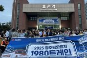 [ 한국미디어뉴스 이종철 기자 ] 광주광역시가 주관하는 ‘2025 광주평화열차 1980 트레인’이 19일 오전 6시30분 효천역을 출발해 경기도 파주시 비무장지대(DMZ)로 향했다. 이번 평화열차에는 340명의 시민이 탑승했으며, 1980년 5월 광주정신을 되새기고 평화와 통일의 가치를 직접 체험할 수 있도록 기획됐다. 지난 6월에 이어 두 번째로 운행하는 이 특별열차는 시민들의 뜨거운 관심 속에 모집 시작 3일 만에 마감됐다. 출발 전 효천역광장에서는 ‘광주가 왔다, 통일이 온다’를 주제로 한 출무식이 열렸다. 고광완 행정부시장이 시민 대표에게 1980년대 열차표를 디자인한 ‘평화행 티켓’을 전달하는 등 의미 있는 시간을 가졌다. 광주평화열차는 효천역에서 임진강역까지 특별기차로 이동하며, 열차 안에서 1980년 5월을 주제로 한 음악다방과 연극 공연 등 시민 참여형 문화 프로그램이 진행된다. 임진강역 도착 후에는 파주시 DMZ 일원에서 안보현장 견학이 이어진다. 고광완 행정부시장은 “세대를 아우르는 다양한 연령층이 참여해 광주의 민주·평화정신을 확산하고 그 의미를 되새기는 새로운 계기가 될 것”