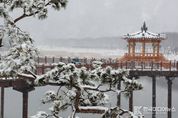 [ 한국미디어뉴스 김풍옥 기자 ] 대설주의보가 내린 24일 하얀 눈이 소복이 내려앉은 충북 괴산군 동진천 옆 소나무길이 겨울 정취를 물씬 풍기고 있다. 내린 눈으로 동진천 산책로와 소나무 가로수길은 순식간에 은빛 풍경으로 변했다. 길게 늘어선 소나무 가지마다 눈꽃이 피어나 장관을 이루고있다