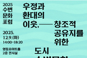 [ 한국미디어뉴스 이원영 기자 ] 영등포문화재단(대표이사 이건왕)은 지난 12월 9일(화) 영등포문화재단 2층 전시실에서 ‘2025 도시수변문화 포럼’을 개최했다고 17일 밝혔다. 이번 포럼은 문화도시 영등포 4년 차 사업의 성과를 점검하고, 도시수변문화의 다음 단계 전략을 모색하기 위해 마련된 자리로, 문화예술 관계자와 시민 등 50여 명이 참석해 성황리에 진행됐다. 2025 도시수변문화 포럼 ‘우정과 환대의이웃, 창조적 공유지를 위한 도시수변 문화’는 공유지, 생태, 커먼즈를 주요 키워드로 도시수변을 생태적 자산이자 문화적 공공공간으로 재인식하고 지속 가능한 수변문화 모델을 논의하는 담론의 장으로 구성됐다. 기조 강연과 두 개의 세션을 통해 정책·연구·예술·시민 실천이 교차하는 논의 구조를 제시했다. 1부에서는 강병근 건국대학교 건축대학 명예교수가 ‘수변감성도시: 자연과 도시의 관계성 회복으로서의 도시 수변’을 주제로 기조 발표를 진행했으며, 이어 도시수변과 생태정책, 시민 참여를 중심으로 한 문화도시 영등포와 영도의 사례 소개, 패널들의 토론이 이어졌다. 2부에서는 ‘생태 커먼즈’를 주제로 인문·예술적 관점에서의 도시수변 실천 가능성을 다뤘다. 도시수변