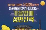 [ 한국미디어뉴스 김풍옥 기자 ] 청주시는 2026학년도 대학수학능력시험을 치른 수험생을 대상으로 ‘가을밤에 성안산책’ 프로그램에서 특별 이벤트를 진행한다고 12일 밝혔다. 11월 성안산책 프로그램에 참여한 수험생에게 성안길상점가에서 사용할 수 있는 상품권(5천원)을 제공하는 내용으로, 2026학년도 수능 수험표를 소지한 수험생에게 적용된다. 가을밤에 성안산책은 9~11월 매주 금요일과 토요일 오후 7시부터 8시까지 한 시간 동안 청주 원도심 문화유산 5곳을 돌며 청주시 문화관광해설사의 해설을 듣는 프로그램이다. 참가 신청은 청주여기 모바일 앱을 통해 가능하며, 사전 신청한 선착순 40명에 한해 상품권이 지급될 예정이다. 한편, 가을밤에 성안산책은 오후 7시 이후 유동 인구가 급감하는 성안길과 중앙공원 일대를 활성화하기 위해 기획됐다. 지난 10일 기준 누적 참여인원은 558명을 기록, 원도심을 대표하는 신규 야간관광 체험 콘텐츠로 자리매김하고 있다. 이현숙 관광과장은 “시험을 마친 수험생들이 가을밤 정취를 마음 편히 즐기고, 올 한해 지친 마음을 치유할 수 있는 알찬 시간이 되길 바