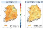 [ 한국미디어뉴스 이원영 기자 ] 기상청은 2025년 7월의 기후 특성과 원인에 대한 분석 결과를 발표했다. 7월 전국 평균기온은 27.1℃로 가장 더웠던 1994년에 이어 역대 두 번째로 높았고, 평년보다 2.5 ℃, 작년보다는 0.9 ℃ 높았다. 중순을 제외하고 상순과 하순에 극심한 무더위가 연일 이어졌다. 북태평양고기압이 우리나라를 덮으면서 6월 말부터 이어진 무더운 날씨는 7월 상순에도 지속됐다. 6월 29일부터 7월 10일까지 2주가량 전국 일평균기온은 1위(각 해당일 기준, 7월 4일은 2위)를 기록했고, 상순의 전국 평균기온도 28.2 ℃로 평년보다 4.8 ℃ 높아 역대 최고 1위를 경신했다. 특히, 8일에는 경기도 일부 지역(의왕, 광명 등)에서 낮 최고기온이 40 ℃ 이상으로 오르기도 했다. 하순에는 북태평양고기압과 함께 티베트고기압의 영향도 더해지면서, 맑은 날이 많아 낮 동안 강한 햇볕으로 기온이 크게 올랐고, 밤에도 높은 기온이 이어지며 밤낮으로 무더위가 지속됐다. 하순의 전국 평균기온은 28.4 ℃로 2위(1위: 2018년 29.3 ℃)를 기록했다. 특히, 25∼30일에는 우리나라로