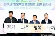 [ 한국미디어뉴스 이원희 기자 ] 파주시는 ㈔딜로이트한마음나눔, 행복나래㈜, 행복도시락 사회적협동조합과 함께 결식 우려가 있는 외국인 노동자 자녀 지원을 위한 ‘행복두끼 프로젝트’업무협약을 체결했다고 밝혔다. 이날 협약식에는 최병갑 파주시 부시장을 비롯해 ㈔딜로이트한마음나눔 유병문 상임이사, 행복나래㈜ 조민영 본부장, 행복도시락 사회적협동조합 최준 사무국장 등 관계자들이 참석해, 아동복지 향상을 위한 상호 협력체계를 구축하기로 뜻을 모았다. 이번 협약을 통해 파주시는 결식 우려 아동을 추천하고, ㈔딜로이트한마음나눔, 행복나래㈜와 행복도시락 사회적협동조합은 해당 아동을 대상으로 도시락을 후원·제작·배송하는 역할을 맡게 된다. 이번 협약을 계기로 파주시 내 결식이 우려되는 외국인 노동자 자녀 40명이 지원을 받게 됐으며, ‘아프리카 10개국 이주민 노동자 공동체’는 해당 아동들이 정기적으로 도시락을 제공받게 된 것에 대해 깊은 감사의 마음을 전했다. 최병갑 파주시 부시장은 “파주시가 행복두끼 프로젝트 사업에 참여하게 되어 뜻깊다”라며 “앞으로도 지역사회 내 어려움을 겪는 아동들에게 희망을 전하는 따뜻