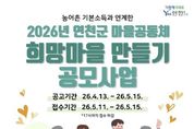 [ 한국미디어뉴스 김서안 기자 ] 연천군 마을공동체지원센터가 농어촌기본소득과 연계한 ‘2026년 희망마을 만들기 주민공모사업’ 참여 공동체를 모집한다. ‘희망마을 만들기 공모사업’은 지역의 인적·물적 자원을 활용해 주민 스스로 마을의 문제점을 발굴하고 해결 방안을 모색해 실행할 수 있는 마을 단위의 주민 주도형 공동체 활동 지원사업으로, 총 10개 공동체를 선정해 팀당 최대 200만 원을 지원할 계획이다. 올해 희망마을 만들기 공모사업은 5월 중 1차 서류심사 및 2차 발표심사를 거쳐 6월 최종 선정되며, 기존과는 다르게 이음메이커(공동체지원활동가)를 공동체와 연계해 현장 밀착형 지원을 강화한다. 이음메이커는 사업 추진 과정에서 공동체가 어려움을 겪는 정산 업무와 운영 방향 설정을 함께 고민하고, 실질적인 활동 역량을 높일 수 있도록 맞춤형 지원을 제공할 예정이다. 신청 대상은 농어촌기본소득을 수급하는 5인 이상의 주민 모임이며, 환경·생태, 돌봄·나눔, 마을 경제, 마을 기록 등 다양한 분야의 활동이 가능하다. 특히 단순 행사나 일회성 사업은 제외하고, 지속가능성과 공익성을 갖춘 공