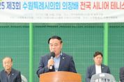 [ 한국미디어뉴스 이보영 기자 ] 수원특례시의회는 9월 24일 만석공원 테니스장에서 열린 ‘제3회 수원특례시의회 의장배 시니어 테니스대회 개회식’ 참석했다. 이번 대회는 테니스를 사랑하는 시니어 동호인들이 한자리에 모여 기량을 겨루고 화합하는 자리로 마련됐다. 개회식에는 이재식 의장을 비롯해 오세철 예산결산특별위원장, 김동은 의원, 이재선 의원, 현경환 의원, 수원시 체육회 관계자 등이 함께해 선수들을 격려했다. 이재식 의장은 축사에서 “오늘은 테니스를 사랑하는 분들이 모두 모인 뜻깊은 날”이라며 “양일간의 대회가 부상 없이 안전하게 마무리되길 바라며, 여러분 모두의 승승장구를 힘껏 응원하겠다”고 말했다. 이어 “수원특례시의회는 시민들께서 생활체육을 통해 활기차고 건강한 일상을 누리실 수 있도록 적극 지원하겠다”고 덧붙였다.