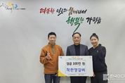 [ 한국미디어뉴스 김서안 기자 ] 가평군 가평읍 경춘로 소재 착한양갈비는 지난 19일 행정복지센터를 방문해 이웃돕기 성금 100만 원을 기탁했다. 이명열 착한양갈비 대표는 “사업체를 운영하면서 우리 지역에 도움 될 수 있는 일이 무엇일까 고민하다 딸의 의견을 들어 적은 금액이지만 어려운 이웃을 위해 기부하는 것이 의미가 있을 것 같아 방문했다”고 말했다. 장석조 가평읍장은 “이명열 대표님과 따님의 귀한 마음이 추운 겨울 우리 가평읍의 어려운 이웃들에게 정말 큰 희망이 될 것”이라고 화답했다. 이명열 대표는 그동안 독거노인을 위한 반찬 지원을 개인 기부를 통해 해오다 올해 가평읍 행정복지센터를 방문해 성금을 기탁했다.