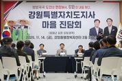 [ 한국미디어뉴스 이원영 기자 ] 김진태 강원특별자치도지사는 '강원특별법' 군사특례를 활용한 첫 권한 행사로 지난 3월 군사규제 개선 성과를 거둔 철원군을 11월 14일 방문해 도지사 ‘마을진담회’(진솔한 +간담회)의 네 번째 자리를 마련했다. 이번 진담회는 주민과의 소통을 강화하고, 현장의 의견을 보다 폭넓게 듣기 위해 철원군을 김화·갈말권역과 철원·동송권역의 두 개 권역으로 나누어 진행했다. 이날 행사에는 김진태 지사를 비롯해, 한기호 국회의원(춘천, 철원, 화천, 양구을), 이현종 철원군수, 김정수·엄기호 도의원, 이장, 주민자치위원, 노인회 등 각계각층의 주민 300여 명이 참석해 뜨거운 관심 속에 진담회가 시작됐다. 이현종 철원군수는 “이번 방문은 지사님께서 철원을 아끼고 주민의 애로사항을 듣고 신속히 반영하고자 하는 마음의 표현”이라고 말했다. 이어 “철원군은 군사규제 100만평 완화, 농업진흥지역 3만 4천 평 해제 등 규제 개선의 가시적 성과를 이뤄냈다”고 설명했다. 또한, “수돗물 하수처리시설 개선을 위해 도비 약 60~70억 원을 지원받아 추진 중이며, 신철원과 와수 지역은 그