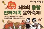 [ 한국미디어뉴스 이보영 기자 ] 중랑구는 오는 11월 8일 토요일 오전 11시부터 용마폭포공원 다목적 광장에서 ‘제3회 중랑 반려가족 문화축제’를 개최한다. 중랑구가 주최하고 ㈜한국어질리티연합이 주관하는 이번 축제는 반려인과 비반려인 모두가 함께 즐기며 사람과 동물이 조화롭게 공존하는 문화를 조성하기 위해 마련됐다. 축제는 무대존, 플레이존, 부스존 등 3개 구역에서 다채로운 볼거리와 즐길 거리를 제공한다. 개회식은 오후 1시부터 류경기 중랑구청장 등 주요 내빈과 지역 주민 200여 명이 참석한 가운데 진행된다. 사전 공모된 ‘2025 중랑 유기동물 입양 사진·수기 공모전’ 시상식이 함께 열리며, 시상식 이후에는 반려견 능력시험과 더불어 행운권 추첨 등 다양한 프로그램이 진행돼 축제의 흥을 돋울 예정이다. 무대존에서는 중랑 K-댕댕이 헌터즈 펫션쇼와 같은 다양한 프로그램이 하루 종일 펼쳐진다. 플레이존은 반려 스포츠와 활동적인 체험 공간으로 구성된다. 펫티켓 5 미션게임, 어린이 훈련사 체험과 반려견 올림픽(기다려·이리와·찾아줘 대회)이 운영되며, 아시아 어질리티 챔피언십 한국 국가대표팀의 시범