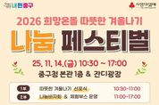 [ 한국미디어뉴스 이보영 기자 ] 서울 중구가 올겨울에도 소외된 이웃들에게 온정을 전한다. 오는 14일 중구청 잔디광장에서 ‘2026 희망온돌 따뜻한 겨울나기’선포식과 나눔바자회를 시작으로 3개월간 나눔 활동을 펼칠 예정이다. ‘2026 희망온돌 따뜻한 겨울나기’캠페인은 중구 주민과 단체, 기업이 함께 참여해 매년 지역사회의 어려운 이웃에게 따뜻한 손길을 전하는 대표적인 겨울철 나눔 캠페인으로 자리 잡았다. 이번 선포식은 오전 10시 30분부터 중구청 잔디광장에서 열린다. 지난 10월 ‘우리는 나눔 키즈’ 행사에 참여한 어린이들이 정성껏 만든 나눔 저금통을 기부하며 첫 나눔 주자로 나선다. 이어 각 동을 대표하는 15명의 나눔 홍보대사들이 함께 무대에 올라 나눔문화 확산을 위한 다짐을 전할 예정이다. 선포식과 함께 열리는 나눔바자회는 오전 11시부터 중구청 본관 1층 로비와 잔디광장에서 다채롭게 펼쳐진다. 지역 내 많은 기업과 전통시장 상인회, 의류업체들이 참여해 풍성한 나눔의 장을 마련했다. 나눔바자회 수익금은 전액 홀몸 어르신, 아동·청소년, 장애인 등 도움이 필요한 이웃들에게 전달된다. 먼저